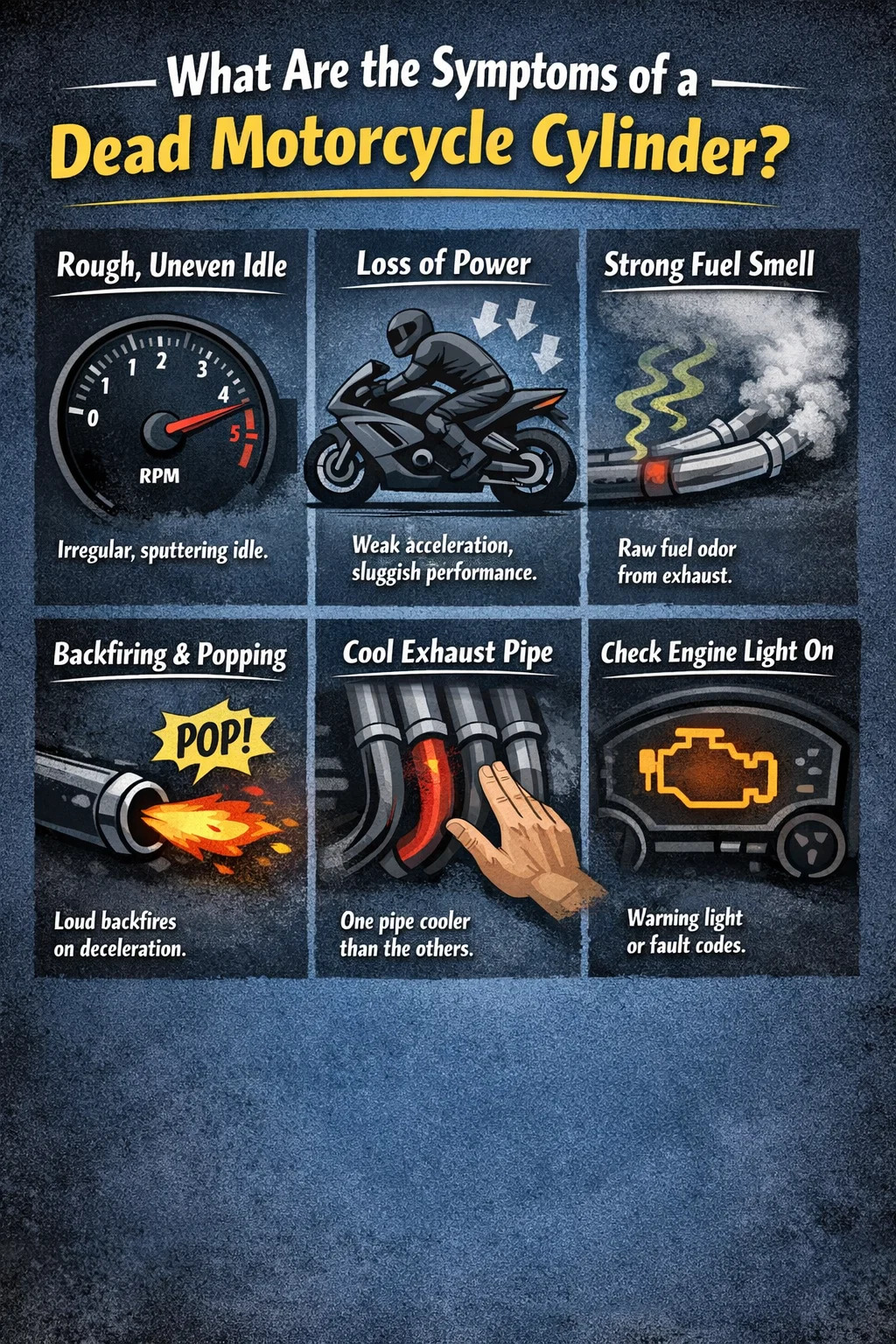 Răspunsul cel mai direct: dacă motocicleta ta funcționează accidentat, are o putere semnificativ redusă, miroase a combustibil nears sau se aprinde rau la ralanti și sub sarcină, există o șansă mare ca unul dintre cilindrii tăi să nu mai tragă. Acest articol vă prezintă toate metodele de confirmare, ce cauzează și cum să o rezolvați.