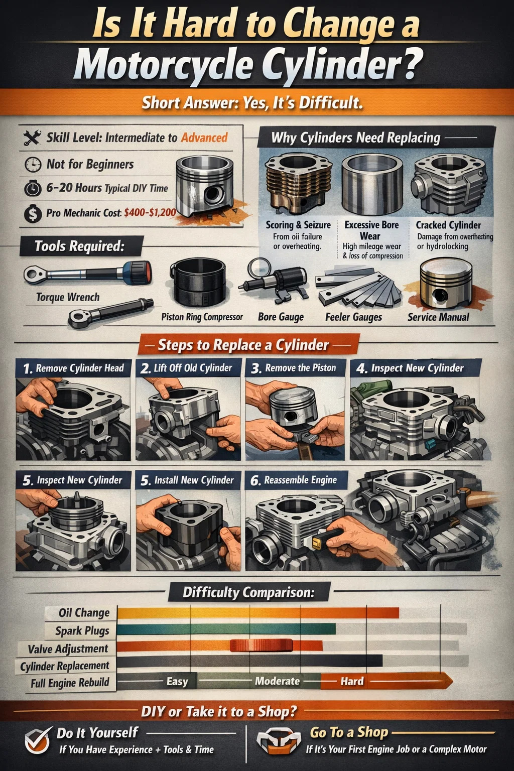 Schimbarea cilindrului unei motociclete este cu adevărat provocator, dar absolut realizabil pentru un mecanic pregătit și răbdător. Dificultatea nu constă în faptul că nici un singur pas este copleșitor din punct de vedere tehnic, ci este în precizia cumulativă necesară în mai mulți pași, fiecare dintre acestea trebuie executat corect pentru ca motorul să funcționeze în mod fiabil ulterior.