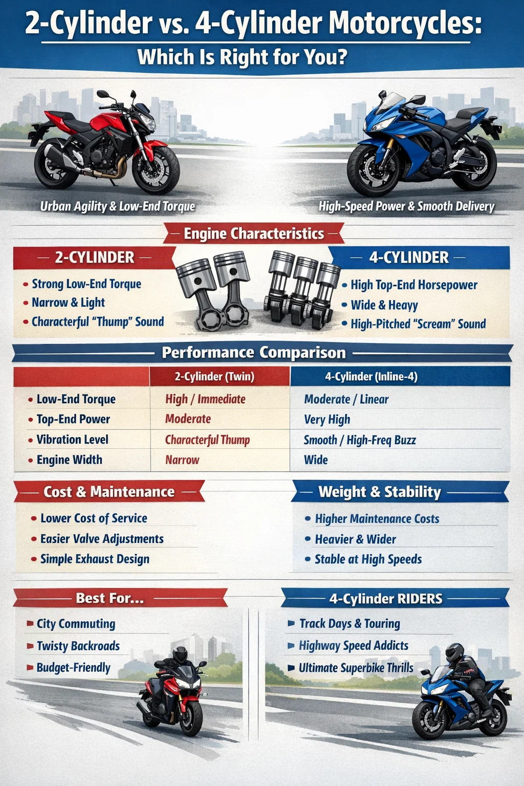 Diferența fundamentală constă în modul în care motorul respiră și se mișcă. Într-o Configurare cu 2 cilindri (adesea un Parallel-Twin sau V-Twin), fiecare individ cilindru de motocicleta este mai mare. Pistoanele mai mari au mai multă masă și o cursă mai lungă, ceea ce se traduce printr-un pumn masiv de cuplu la turații mici. Acest „mormăit” vă permite să vă îndepărtați de semafor cu autoritate, fără a fi nevoie să dansați pe schimbătorul de viteze.