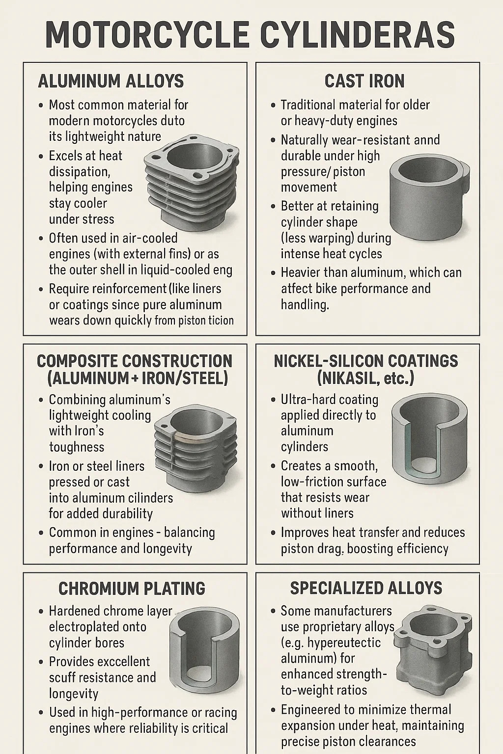 Cilindri de motociclete sunt fabricate în principal din metale alese pentru rezistență, toleranță la căldură și durabilitate. Iată o defalcare detaliată a materialelor comune și a caracteristicilor acestora: